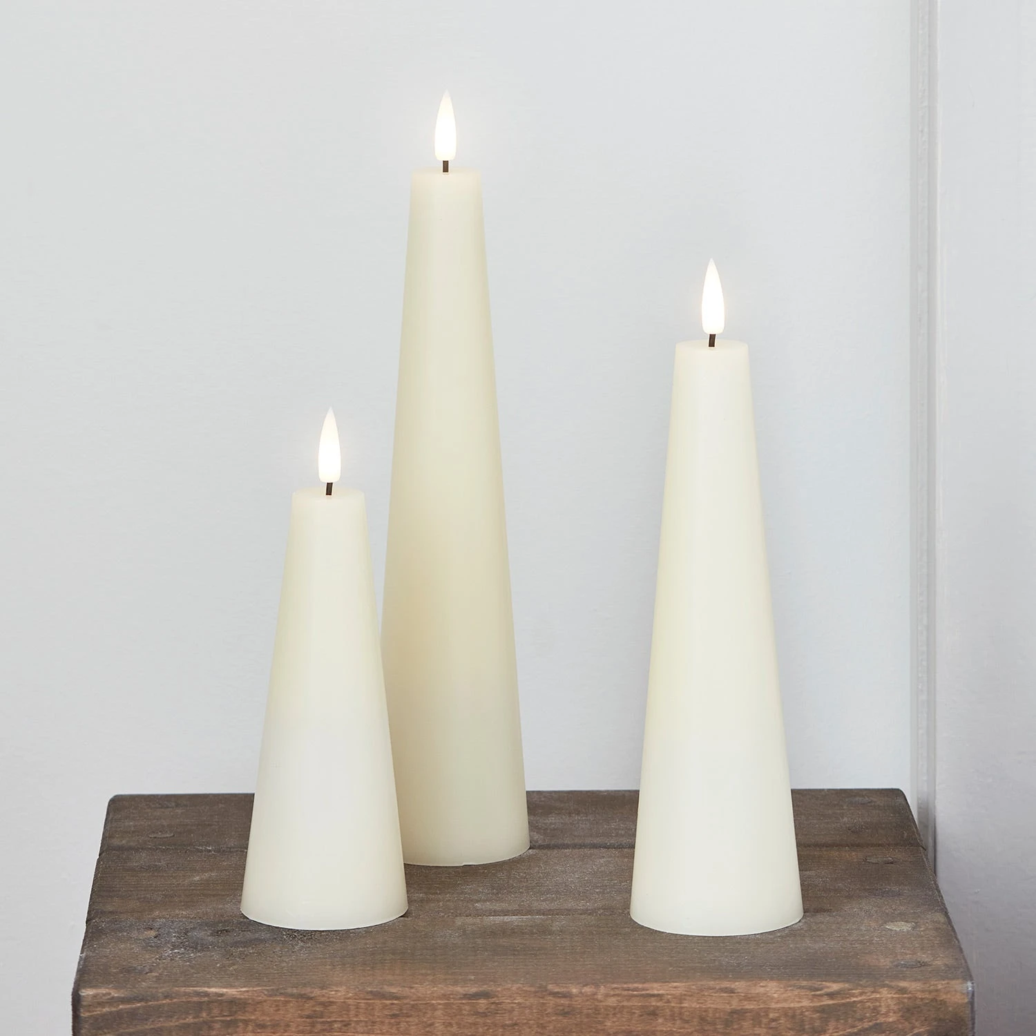 Notre trio de bougies coniques ivoire ajoutera une lueur élégante et chaleureuse à n’importe quelle maison ou occasion. Fabriquées à partir de cire véritable versée à la main et avec notre look exclusif TruGlow® « juste allumé », ces bougies LED imitent parfaitement l’apparence d’une vraie bougie. || La flamme vacillante très réaliste est froide au toucher, vous pouvez donc donner à ce trio le style que vous souhaitez tout en sachant qu’elles sont totalement sûres. Avec trois hauteurs différentes de 17,5 , 22,5 et 27 cm, et une forme conique contemporaine, ces bougies constituent un élément de design idéal pour votre maison. Il suffit d’insérer 2 piles AA dans la base de chaque bougie et d’opter pour le minuteur de 6 heures pour une illumination automatique nuit après nuit.