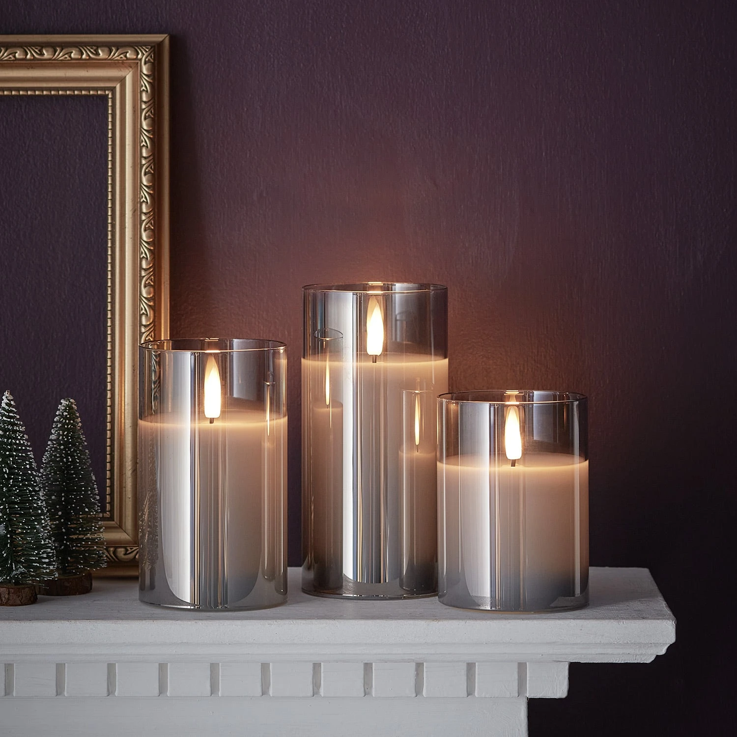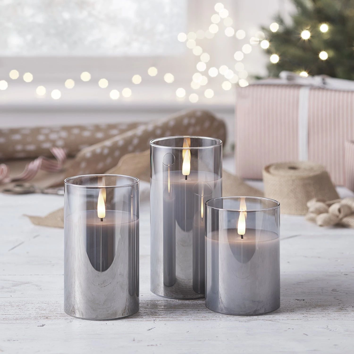 Abritées par un bougeoir en verre gris fumé pour une touche élégante, ce trio de bougies TruGlow® est des plus tendance. || Alliant cire moulée à la main et technologie innovante, la LED dansante de nos bougies imite à la perfection la flamme tremblotante de vraie bougies tout juste allumées. De hauteur différente, 15,12,5 et 10cm, ces bougies resteront toujours froides et sans danger. Insérez 2 piles AA dans la base de chaque bougie et choisissez la fonction minuterie pour un allumage automatique soir après soir. Les bougies vous illumineront jusqu’à 600h avant que vous ne deviez en changer les piles.