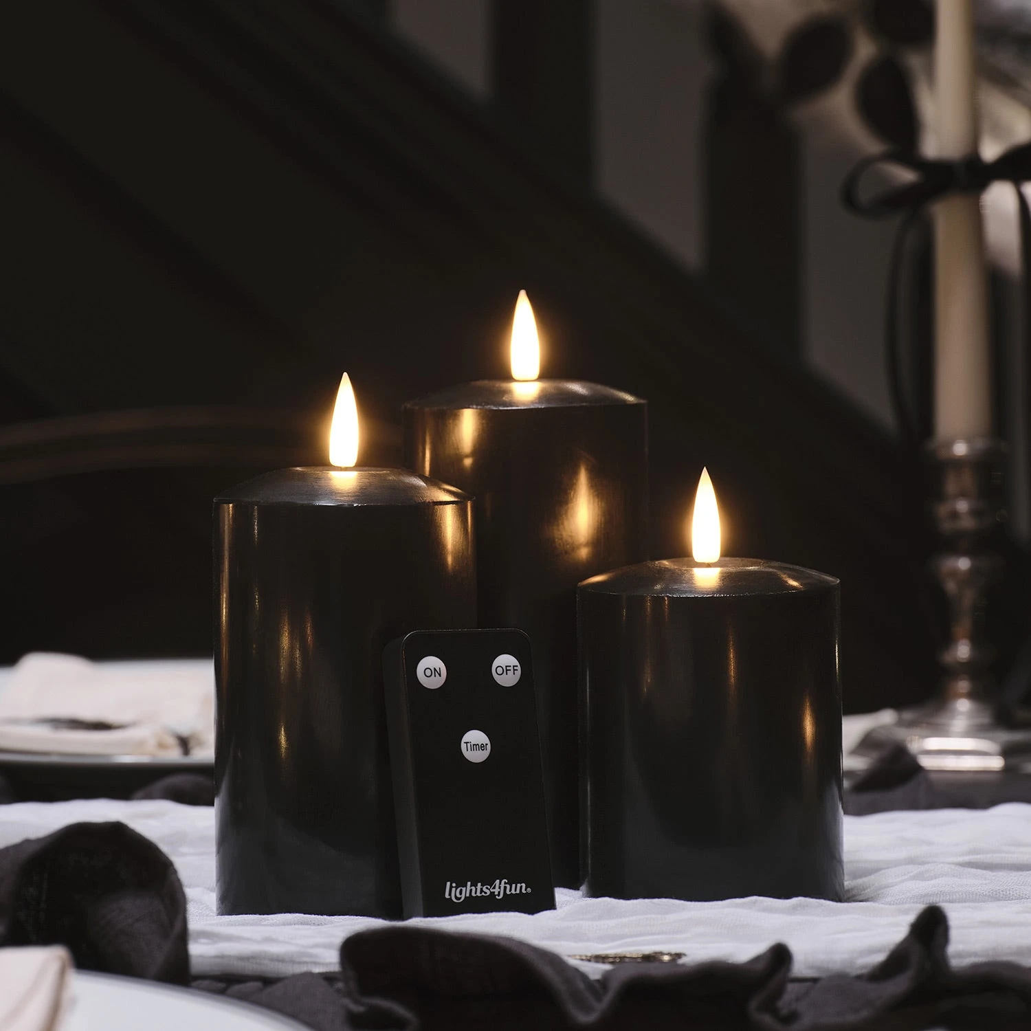 Plongez dans l’atmosphère envoûtante d’Halloween avec notre ensemble de trois bougies piliers TruGlow® noires, idéales pour ajouter une touche de mystère et d’élégance à votre décor. Elles combinent de la véritable cire coulée à la main avec une technologie innovante qui imite à la perfection le scintillement d’une vraie flamme, offrant ainsi un réalisme incomparable. Disponibles en trois hauteurs différentes 15 cm, 12,5 cm et 10 cm, ces bougies créent un effet saisissant lorsqu’elles sont disposées ensemble et sont totalement sûres grâce à leurs LED qui restent froides au toucher. Il suffit d’insérer deux piles AA par bougie et d’activer la fonction minuterie de 6 heures pour profiter d’un éclairage automatique chaque soir. Cela garantit jusqu’à 600 heures d’éclairage avant de devoir remplacer les piles.
