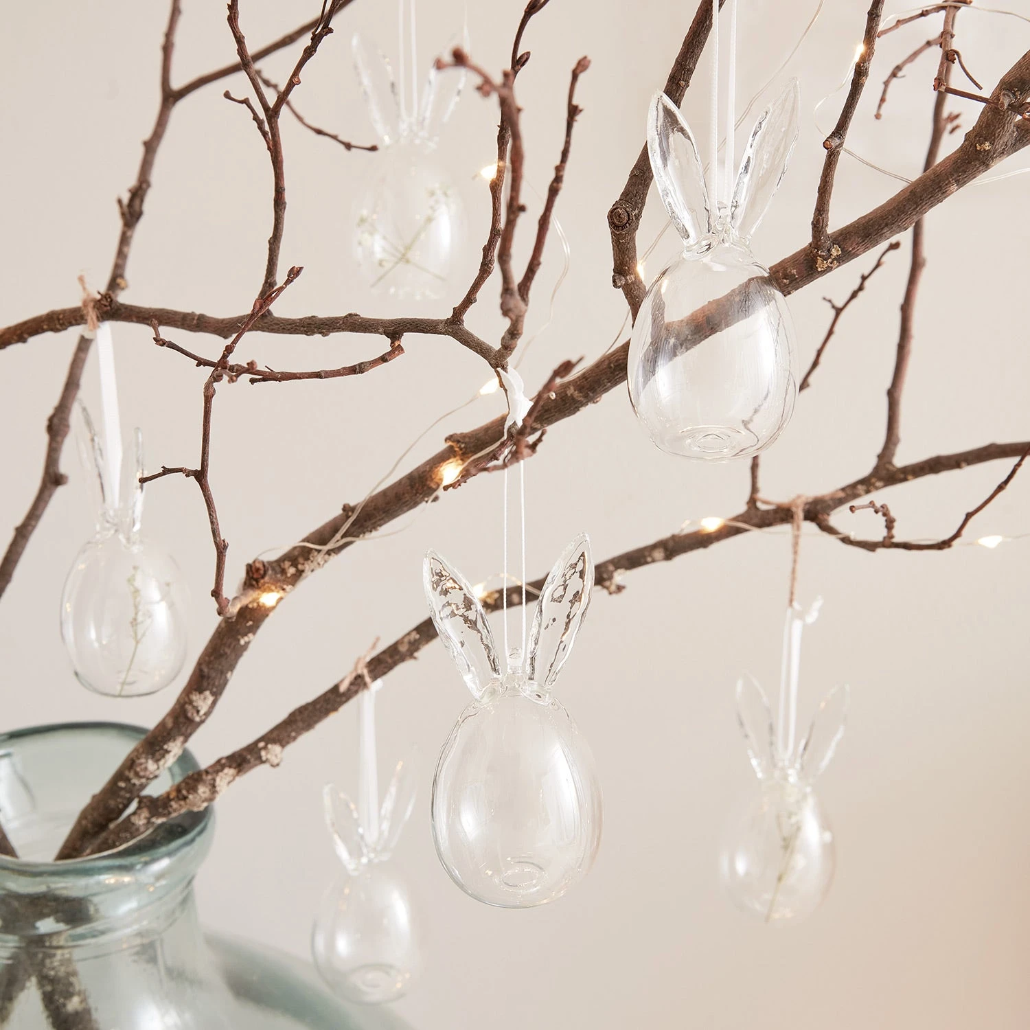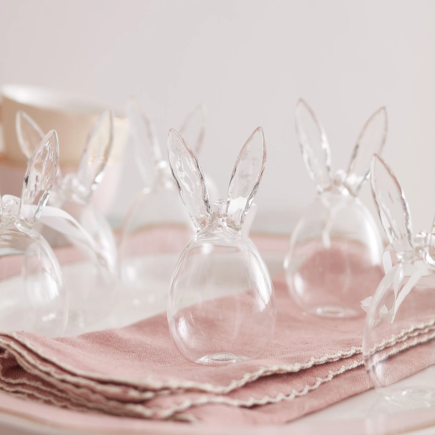 Ajoutez une petite touche pascale à votre intérieur ce printemps avec nos décorations en forme d’œufs de pâques aux oreilles de lapin en verre transparent. Ce lot contemporain comprend 6 œufs mesurant 9,5 cm de hauteur. Une manière très élégante à la fois minimaliste de célébrer la saison de Pâques tout en gardant un décor neutre. Fabriqués en verre borosilicate délicat et accompagnés d’un ruban blanc, ils sont très polyvalents. Suspendez-les à des branches d’arbre pour créer une pièce saisonnière très originale, ou utilisez-les comme marque-places pour vos goûters de Pâques.