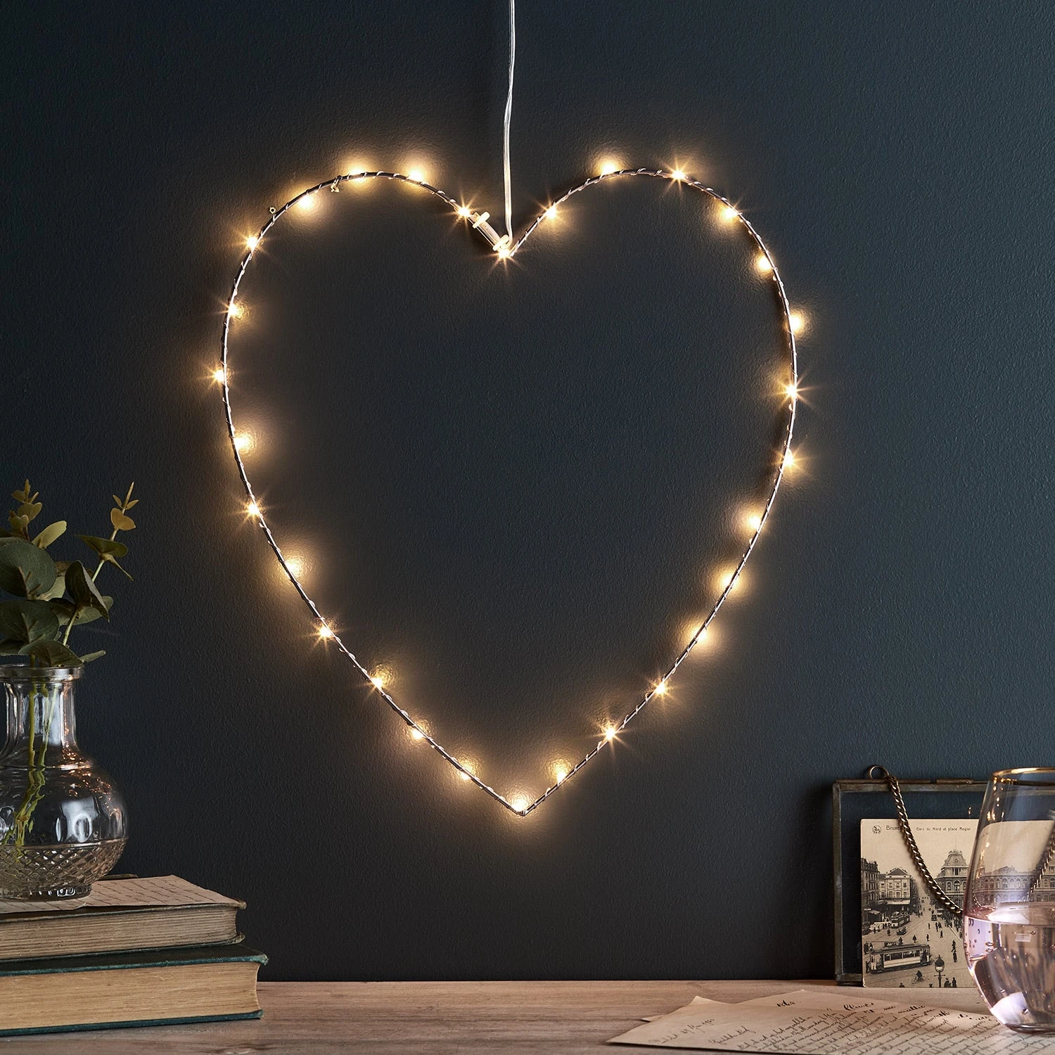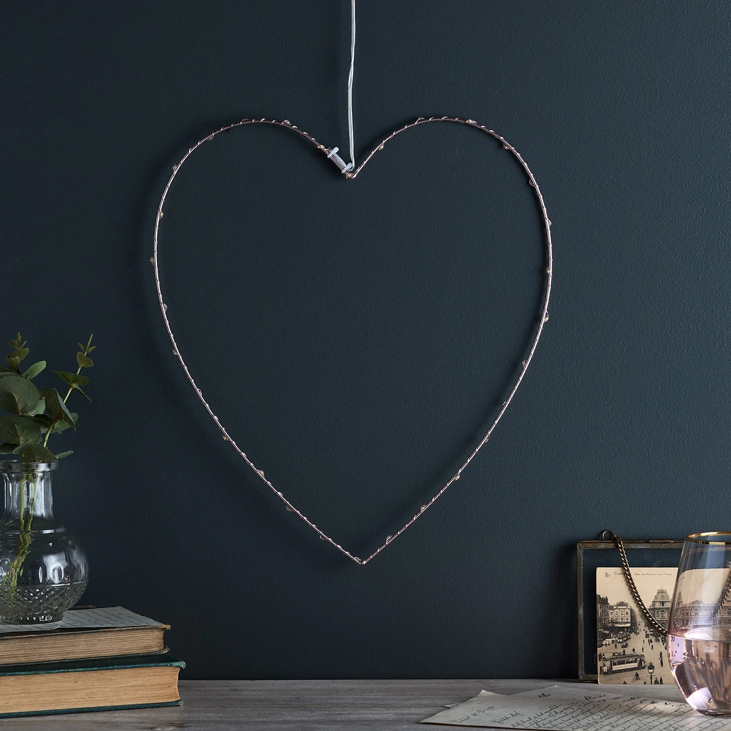 Apportez une touche d’or rose à votre intérieur avec notre cœur lumineux à micro LED. Avec 30 LED blanc chaud réparties sur le cadre cœur en métal de 34cm de haut, c’est un accessoire discret et délicat idéal pour illuminer une étagère ou à utiliser en applique murale. || Le câble d’alimentation de 3m vous permet de le placer où vous le souhaitez ! Branchez-le tout simplement et profitez de sa douce lumière soir après soir !