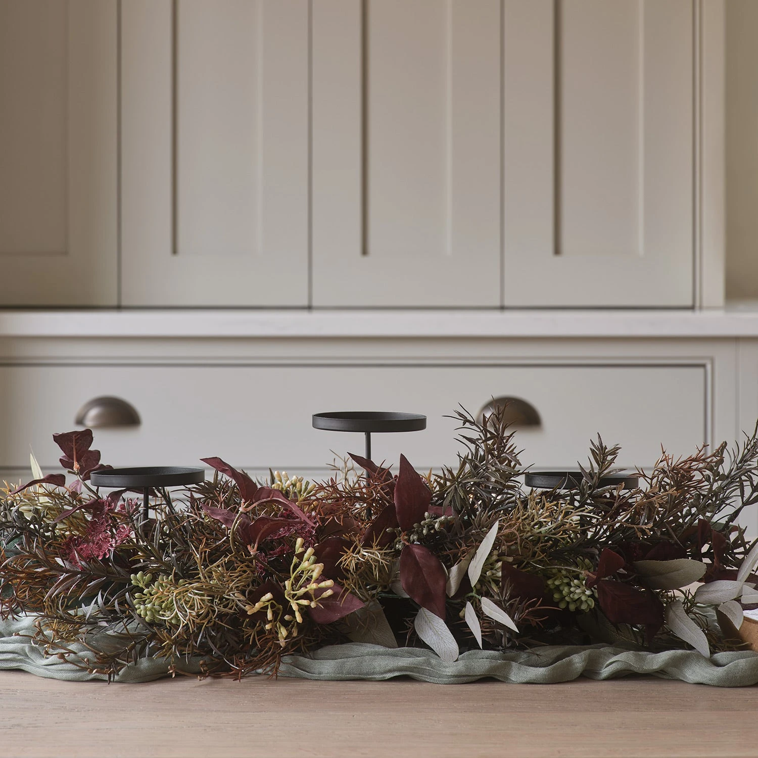Apportez une touche d’élégance automnale à votre décoration avec notre centre de table automnal trio de porte-bougies. Ce modèle se compose de trois sphères métalliques plates, de hauteurs différentes, nichées dans un cadre en brindilles naturelles, rehaussé de feuillages artificiels aux teintes riches de rouge, d’ocre, de gris et de vert, une composition raffinée qui sublimera votre intérieur. Il vous suffit d’y poser vos bougies sur les supports prévus et de laisser la magie opérer.
