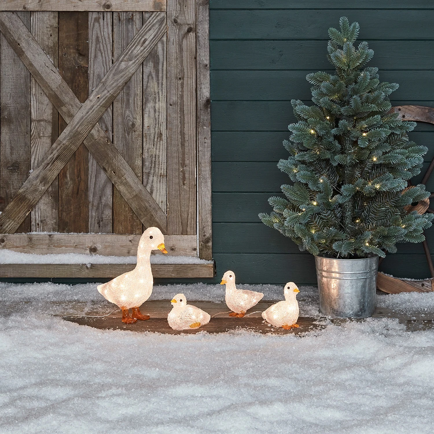 Ces charmantes déco de Noël apporteront une touche toute mignonne à votre déco ! Comprenant la maman et ses 3 canetons, cette famille émerveillera petits et grands ! || Placez-les en extérieur devant votre entrée pour offrir une lueur accueillante à vos invités ! Fabriqués en acrylique, ils résisteront parfaitement à la météo hivernale année après année. Pour les allumer, insérez 3 piles AA dans le boîtier à piles de la cane et celui des canetons (un seul boîtier pour les 3) et choisissez la fonction minuterie pour un allumage automatique.