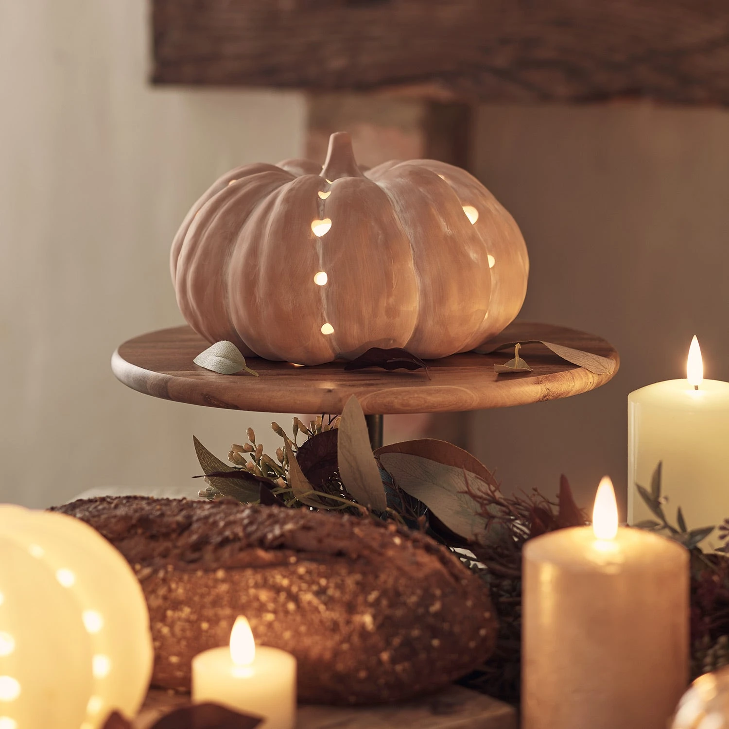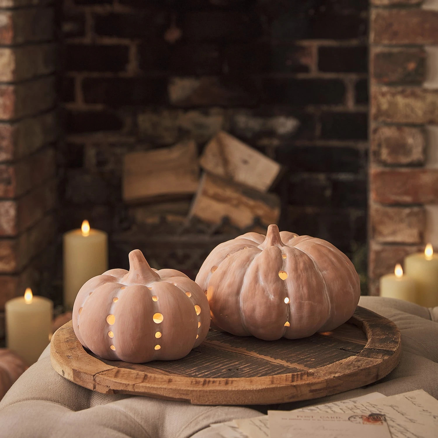 Laissez-vous transporter au cœur d’un champ de citrouilles cet automne avec notre duo de décorations lumineuses en forme de citrouille. || Ces pièces intemporelles, d’une hauteur respective de 12,5 cm et 9 cm, sont parfaitement résistantes à l’eau et peuvent être utilisées aussi bien à l’intérieur dans le cadre d’une décoration d’automne qu’autour de votre porte d’entrée et de votre porche pour accueillir vos invités. Conçus dans une couleur terre cuite naturelle, ces accessoires décoratifs faits à la main prennent une teinte orange foncé lorsqu’ils sont mouillés et retrouvent leur teinte d’origine lorsqu’ils sont secs. Chaque citrouille est équipée d’une LED blanc chaud qui diffuse une lueur accueillante et apaisante à travers ses découpes minimalistes le soir venu. Pour les allumer, il suffit d’insérer 3 piles AAA dans la base de chaque citrouille, 2 piles AAA dans la télécommande et de sélectionner la fonction minuterie optionelle de 6 heures pour une illumination automatique à la même heure chaque soir.