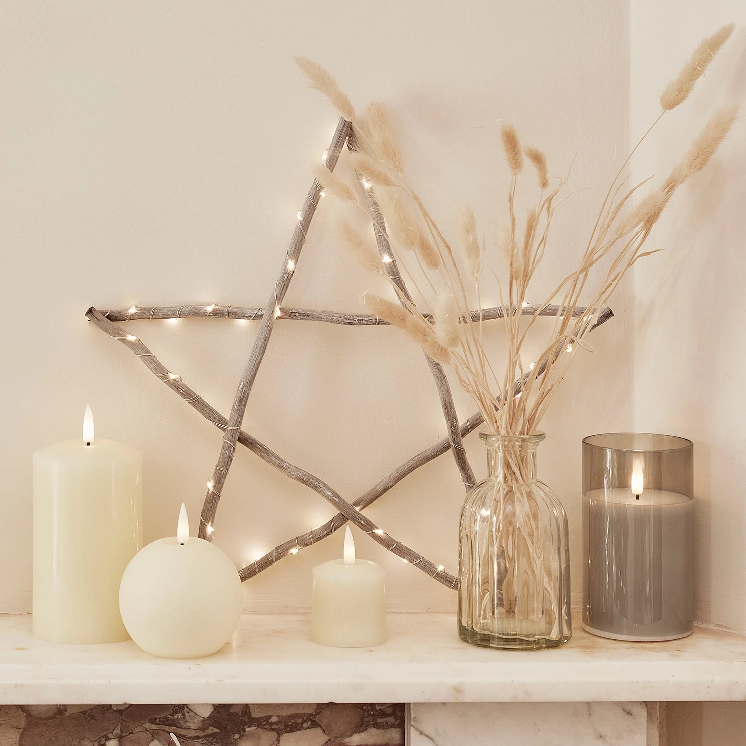 Apportez un accent rustique à votre intérieur avec notre étoile en bois. Avec un diamètre de 36 cm et ornée de 50 LED blanc chaud le long de son cadre, cette étoile fera scintiller subtilement votre manteau de cheminée ou l’encadrement d’une fenêtre pendant les fêtes. || Fabriquée en bois et peinte en gris clair, c’est un bel objet déco de jour qui s’illumine d’une délicate lueur la nuit. Insérez les piles et choisissez la minuterie pratique de 6 h pour qu’elle s’allume automatiquement à la même heure tous les soirs !