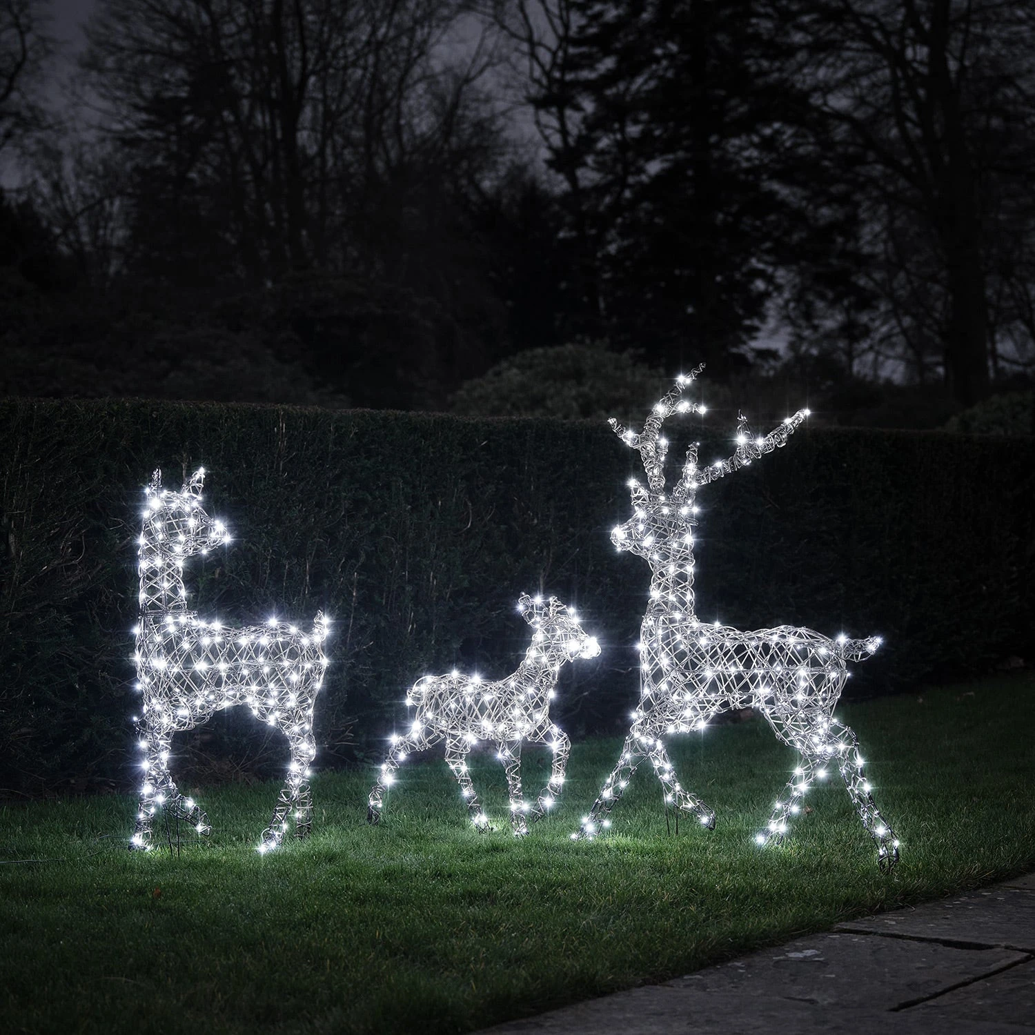 Créez une scène hivernale magique avec notre famille de rennes lumineux Studley à LED bicolore. Conçus en rotin synthétique résistant tissé sur une armature métallique, le cerf, la biche et le faon diffusent une lumière blanc chaud, blanc froid ou un mélange des deux grâce à leurs LED intégrées, pour une ambiance féerique de jour comme de nuit.