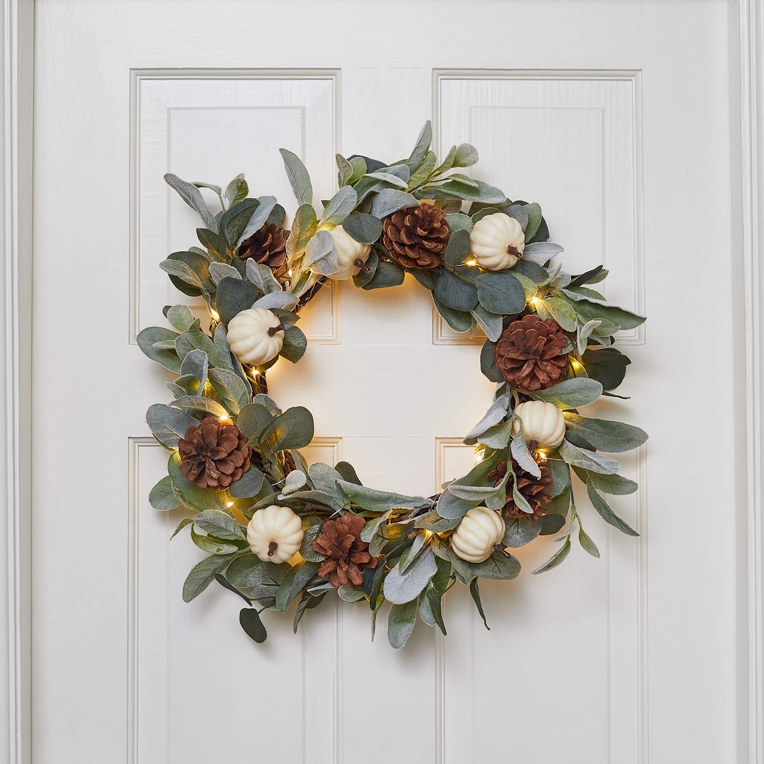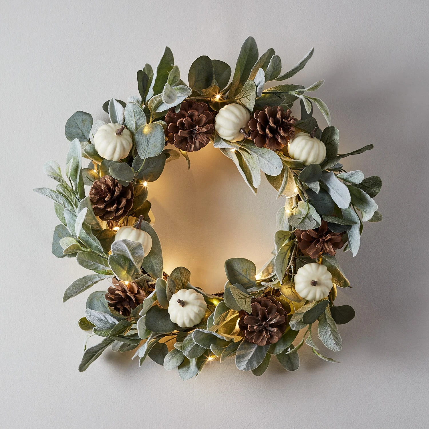 Le combo parfait pour la saison ! Nous avons associé une guirlande micro LED à notre couronne citrouilles et eucalyptus pour créer un objet ultra tendance cette saison. || Dotée de feuillages d’eucalyptus artificiels, de pommes de pin et de citrouilles, cette couronne fera son plus bel effet accrochée sur une porte d’entrée ou posée au centre d’une table. La guirlande micro LED est incroyablement souple et peut donc être entortillée autour de la couronne en toute facilité ! Insérez simplement les piles, programmez la minuterie facultative et attendez qu’elle s’illumine tous les soirs à la même heure.
