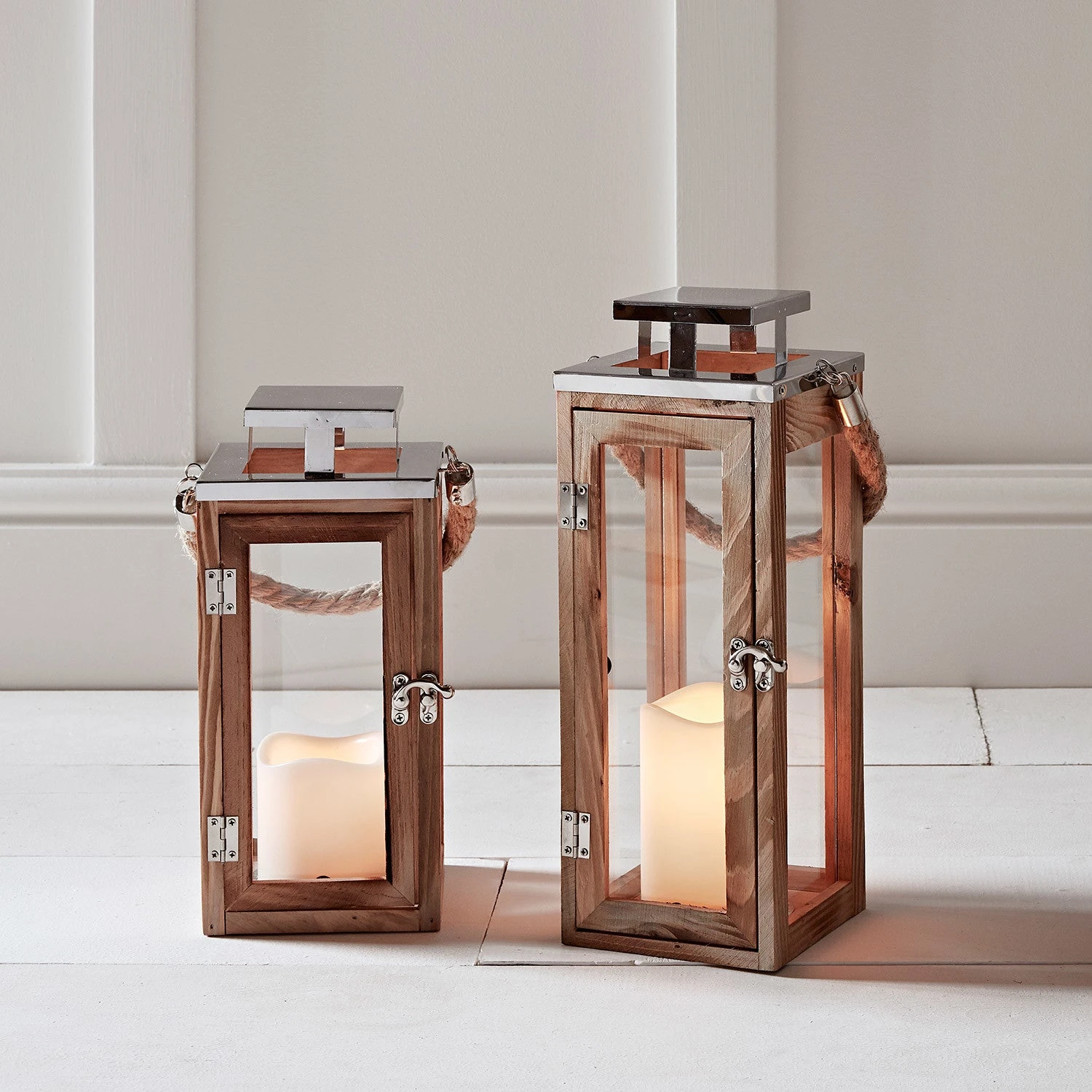 Installez ce joli duo de lanterne dedans ou dehors si le temps est sec. Fabriqué à base de vrai bois et avec une anse en corde et des embouts chromés, ce lot est vraiment élégant. Chaque lanterne abrite une bougie LED vacillante qui diffuse une lueur ambre tamisée. La petite lanterne mesure 26 cm de haut et la grande mesure 34 cm.