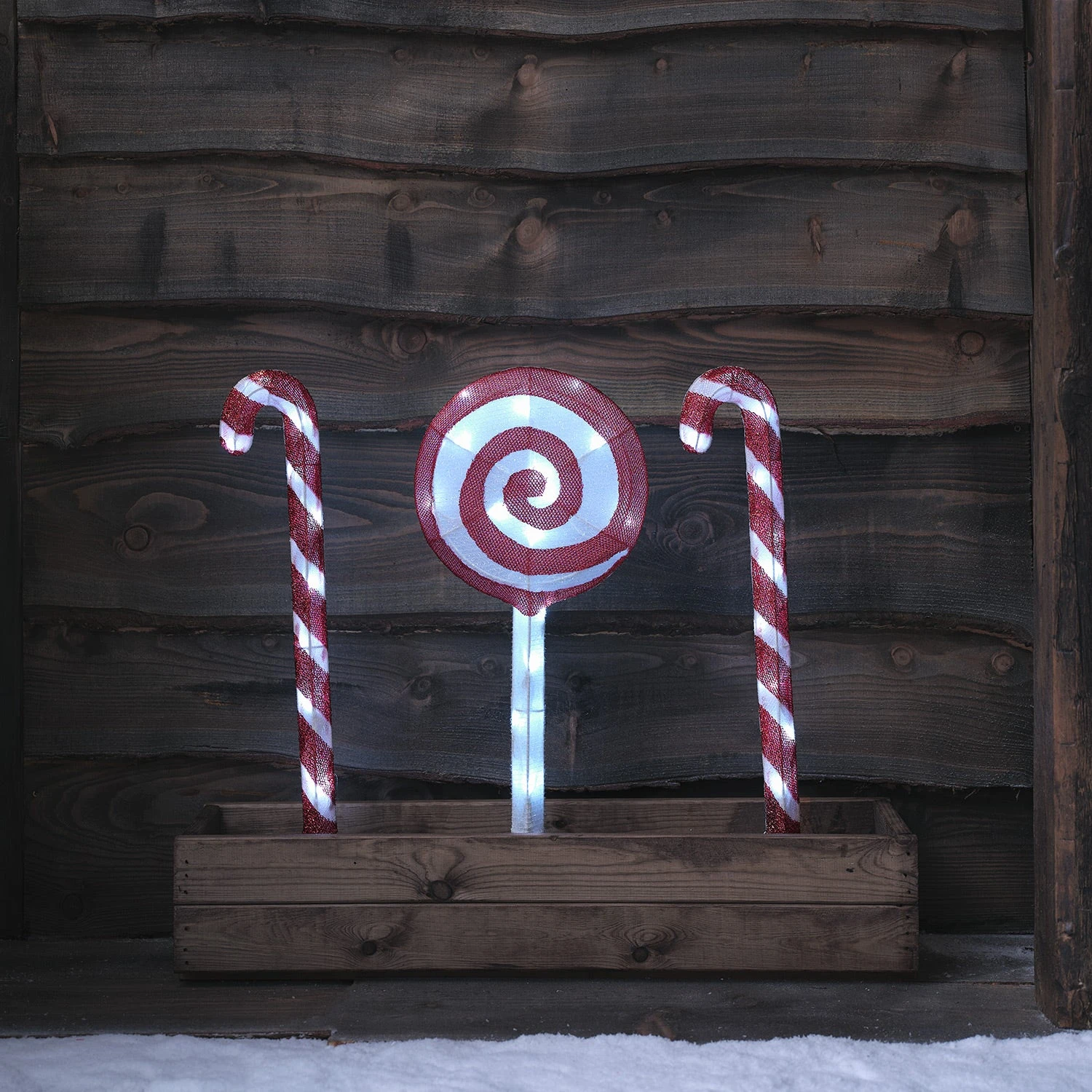 Transformez votre jardin avec notre lot de 3 balises lumineuses en forme de sucres d’orge et de sucette. D’une hauteur de 60 cm et illuminées par un total de 35 LED blanc chaud, ces balises de jardin apporteront chaque soir une ambiance festive à votre espace extérieur. Pour préserver l’apparence de ces décorations de Noël revêtues de tissu, il est recommandé de les installer sur une terrasse extérieure couverte ou une véranda. Il vous suffit d’insérer des piles 3 D dans le compartiment prévu à cet effet et d’activer la fonction optionnelle de minuterie de 6 heures pour une illumination automatique chaque soir à la même heure.