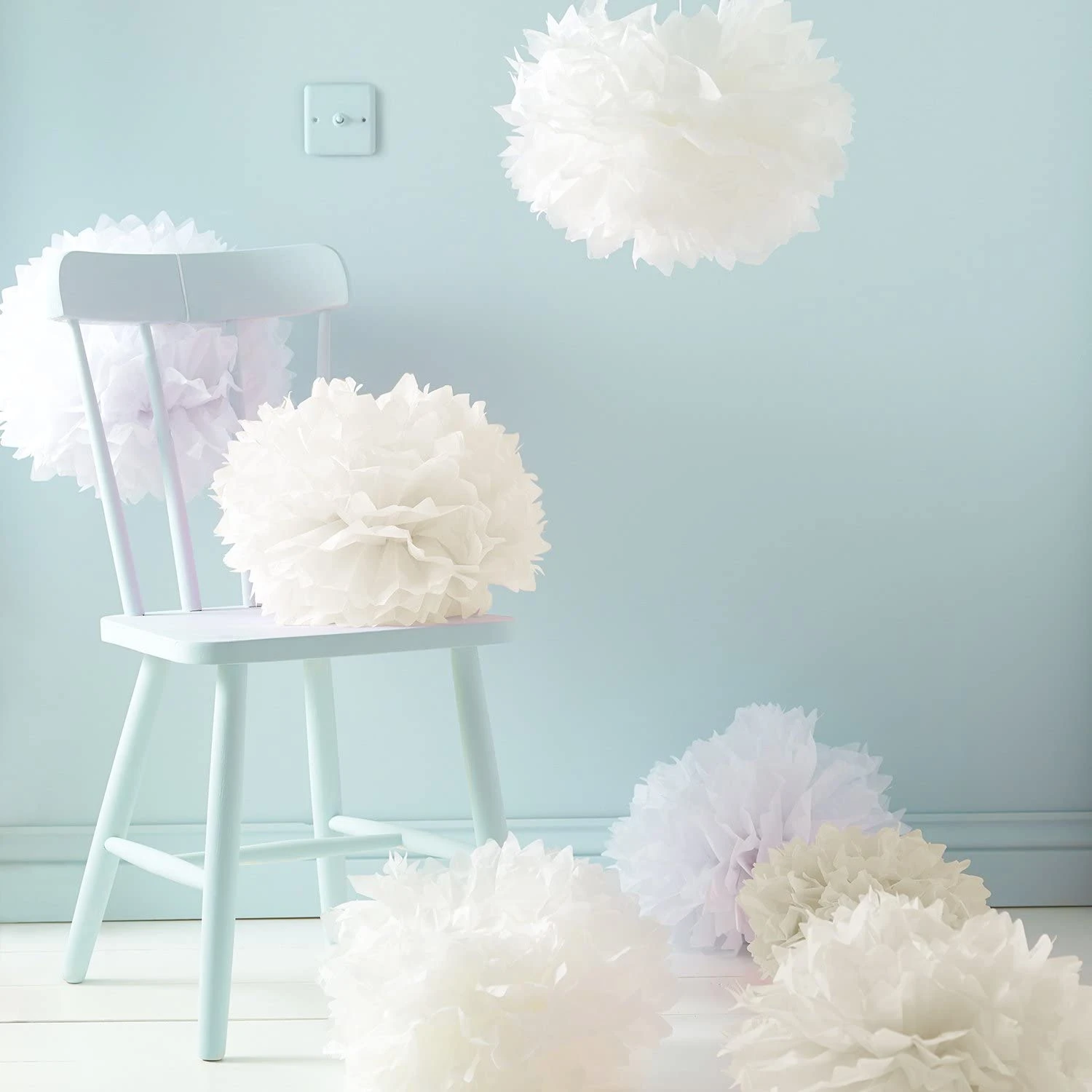 Ce lot comprend un assortiment de pompons de tailles différentes idéal pour décorer un mariage ou tout autre occasion. Pour les assembler rien de plus facile, il vous suffira de disposer chaque pompon sur une surface plate et froissez gentiment chaque couche de papier. || Suspendez-les où bon vous semble (marquis, salle de réception, chambre,…) individuellement ou en groupe en utilisant les rubans blancs inclus. Et le tour est joué !