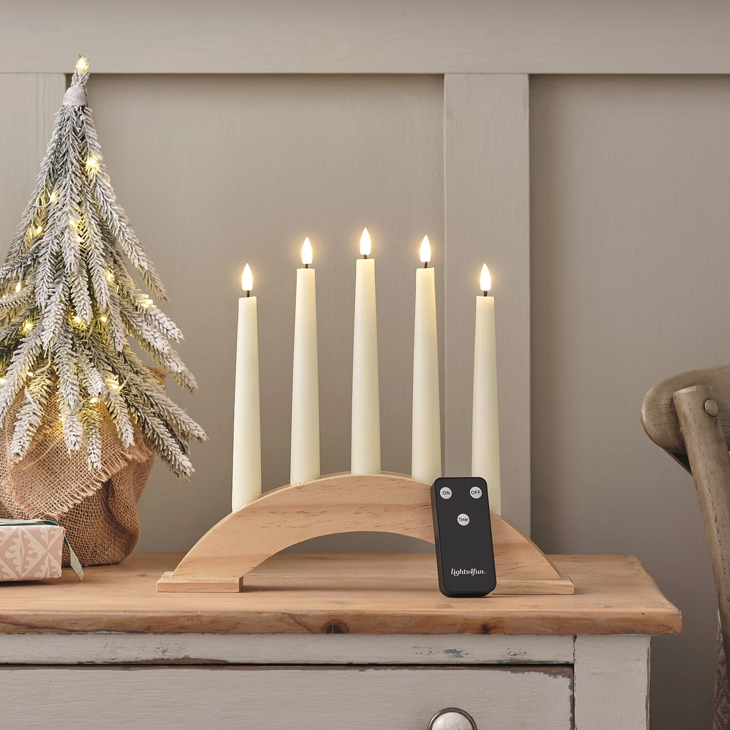Ajoutez une note chaleureuse et traditionnelle à votre décoration de Noël avec notre magnifique pont de bougies en bois. Équipé de cinq chandelles LED TruGlow® d’un blanc ivoire, ces bougies en cire véritable mesurent 20 cm de haut et sont dôtées de flammes incroyablement réalistes, reproduisant à la perfection la lueur chaleureuse des vraies bougies. Que ce soit sur un manteau de cheminée, sur un rebord de fenêtre ou en tant que pièce maîtresse de votre table, ce pont de bougies TruGlow® ajoutera une ambiance festive et accueillante à votre intérieur pendant les fêtes de fin d’année. Il vous suffit d’insérer une pile AAA dans la base de chaque bougie et d’activer la minuterie optionnelle de 6 heures pour profiter d’une illumination automatique à la même heure chaque soir.